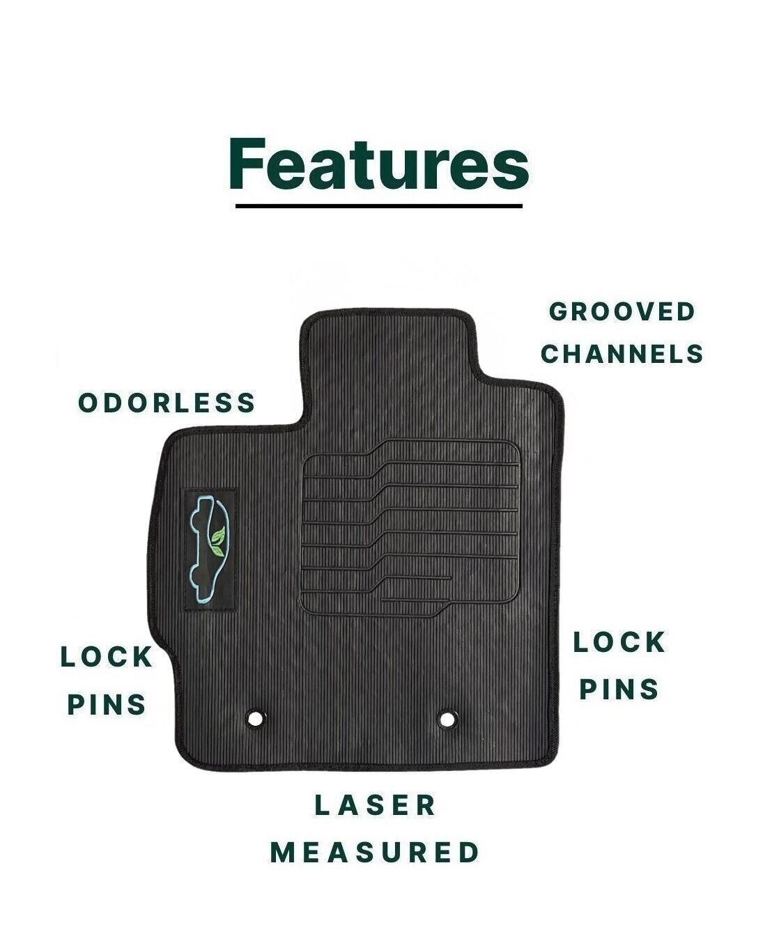 All ecoMats floor mats have Non-Slip Driver Heel Pad that gives your foot an extra grip. All floors have also safety locks that fit the manufacture's lock pins and Velcro tapes to keep your floor mats in place when your car is moving.
