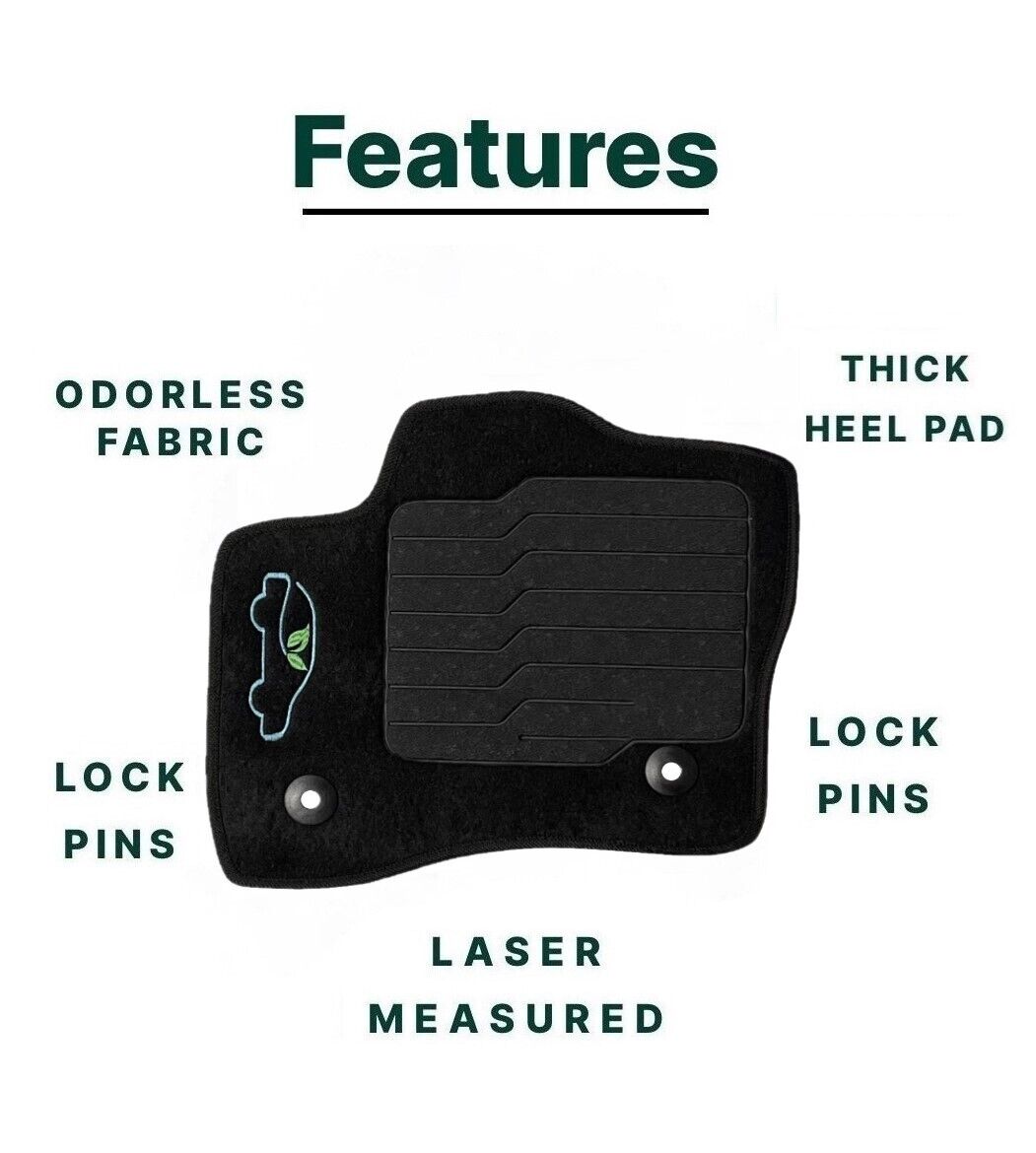 All ecoMats floor mats have Non-Slip Driver Heel Pad that gives your foot an extra grip. All floors have also safety locks that fit the manufacture's lock pins and Velcro tapes to keep your floor mats in place when your car is moving.