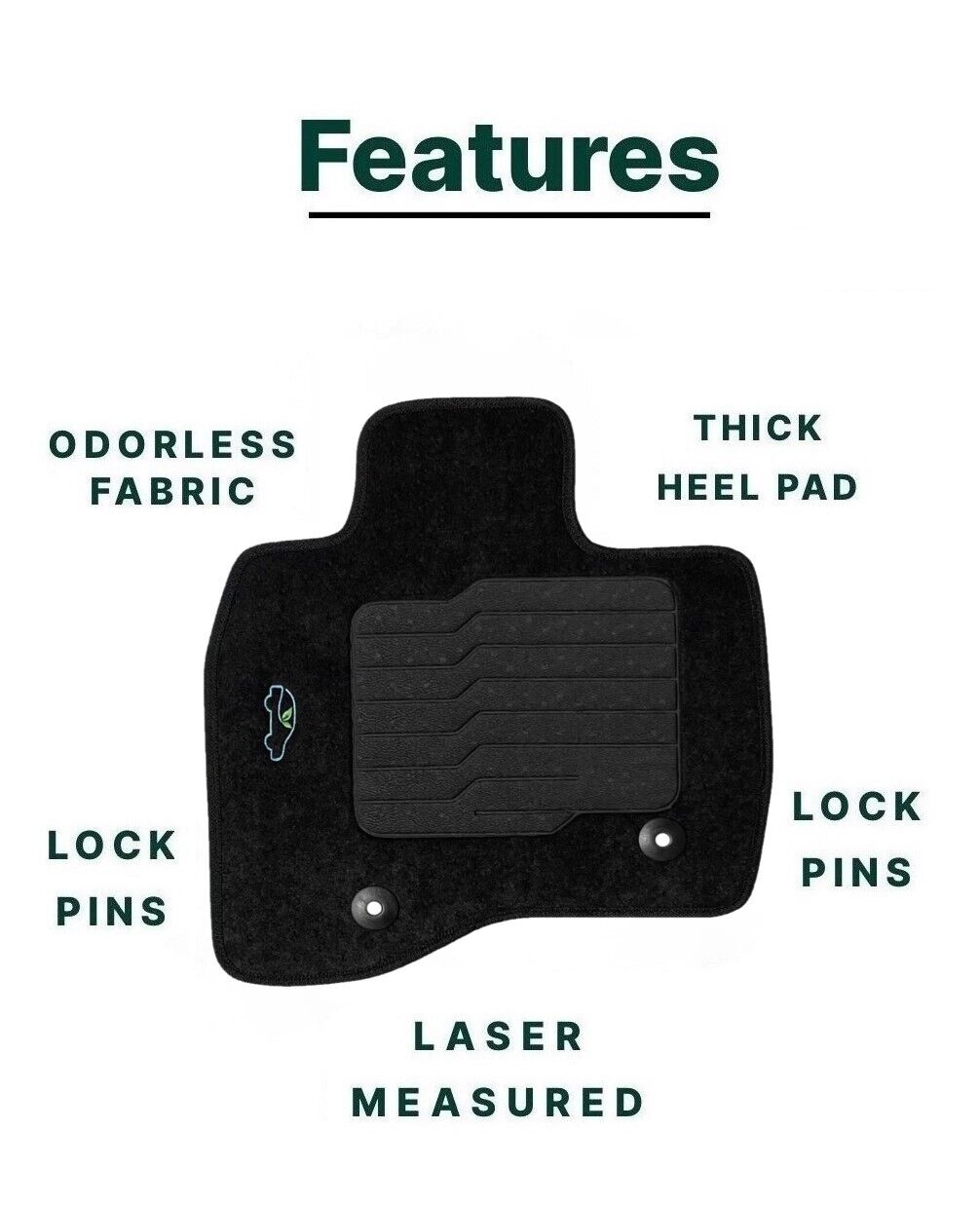 All ecoMats floor mats have Non-Slip Driver Heel Pad that gives your foot an extra grip. All floors have also safety locks that fit the manufacture's lock pins and Velcro tapes to keep your floor mats in place when your car is moving.