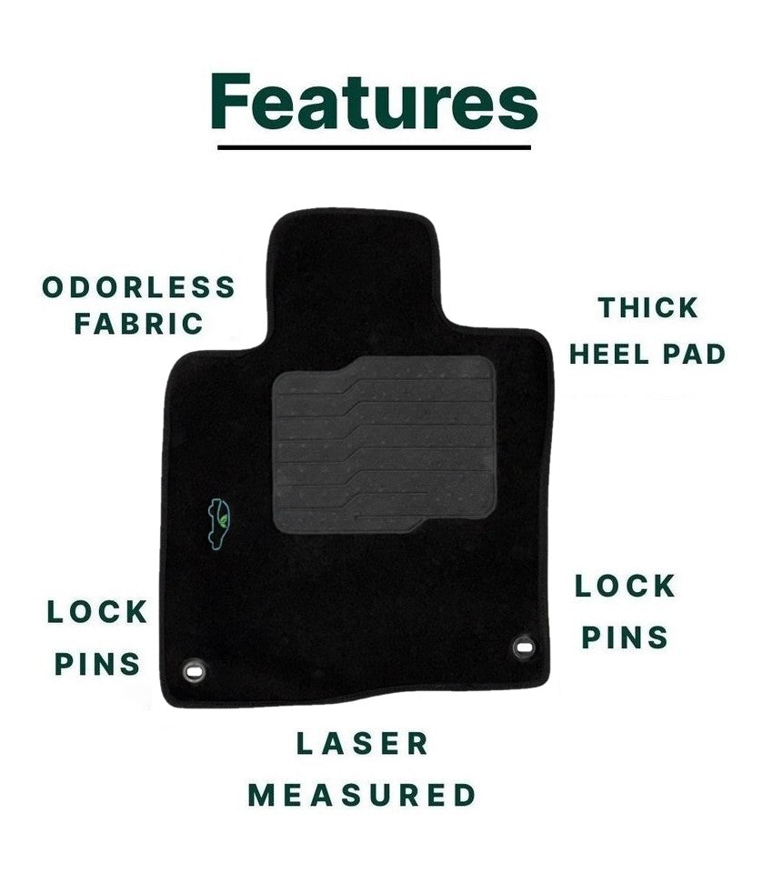 All ecoMats floor mats have Non-Slip Driver Heel Pad that gives your foot an extra grip. All floors have also safety locks that fit the manufacture's lock pins and Velcro tapes to keep your floor mats in place when your car is moving.