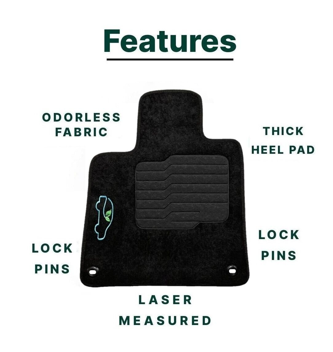 All ecoMats floor mats have Non-Slip Driver Heel Pad that gives your foot an extra grip. All floors have also safety locks that fit the manufacture's lock pins and Velcro tapes to keep your floor mats in place when your car is moving.