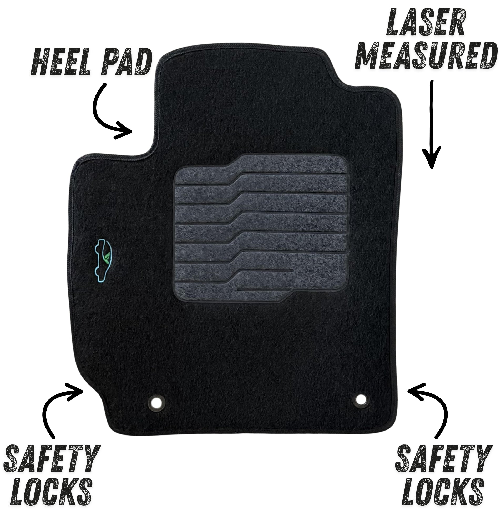All ecoMats floor mats have Non-Slip Driver Heel Pad that gives your foot an extra grip. All floors have also safety locks that fit the manufacture's lock pins and Velcro tapes to keep your floor mats in place when your car is moving.