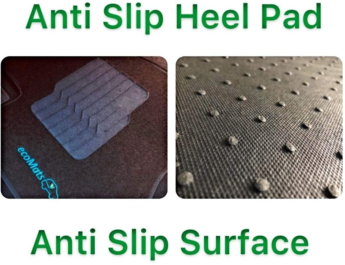 All ecoMats floor mats have Non-Slip Driver Heel Pad that gives your foot an extra grip. All floors have also safety locks that fit the manufacture's lock pins and Velcro tapes to keep your floor mats in place when your car is moving.