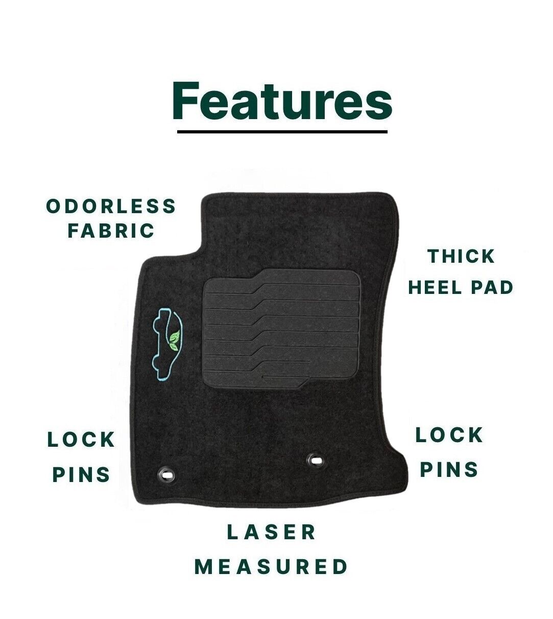 All ecoMats floor mats have Non-Slip Driver Heel Pad that gives your foot an extra grip. All floors have also safety locks that fit the manufacture's lock pins and Velcro tapes to keep your floor mats in place when your car is moving.