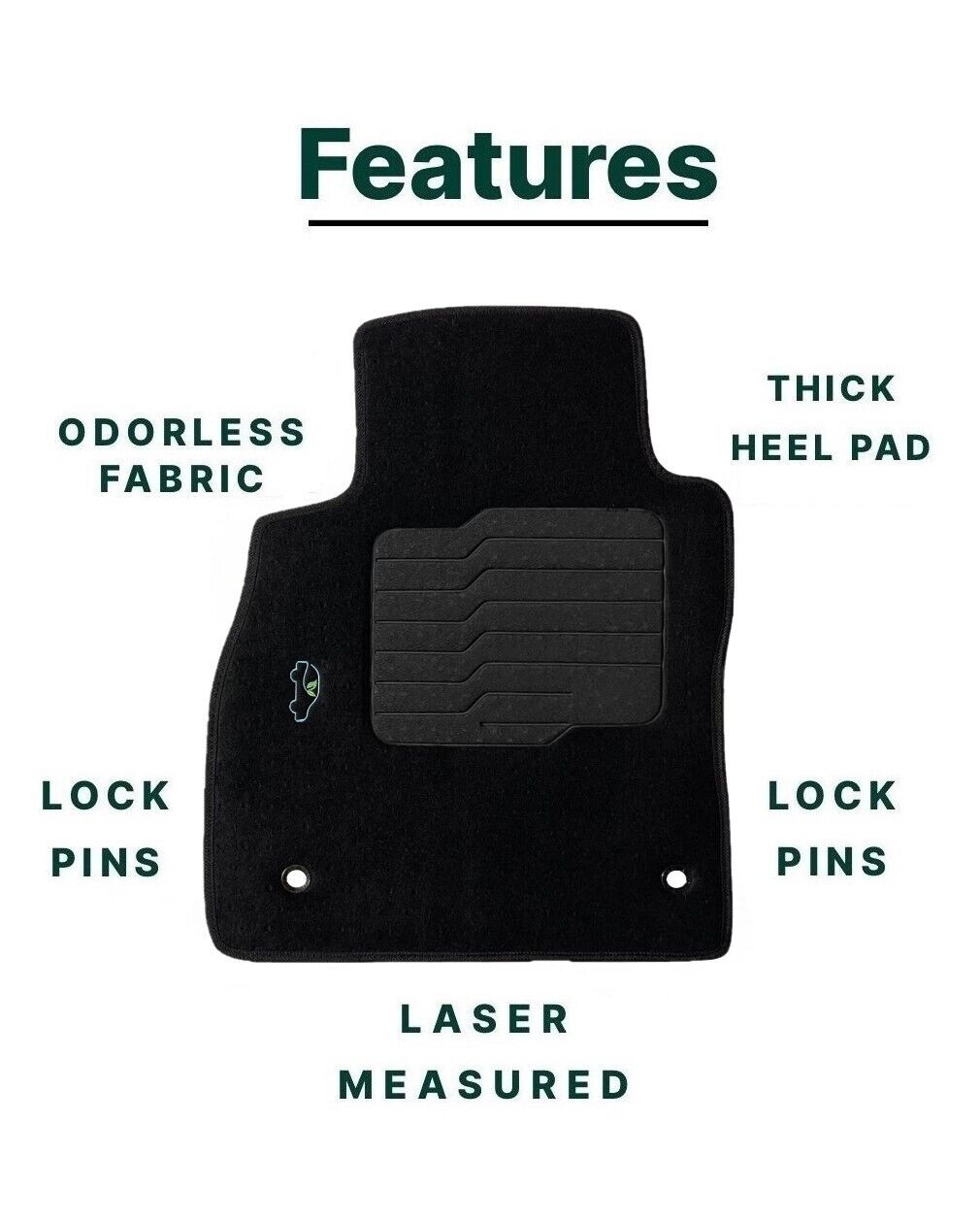 All ecoMats floor mats have Non-Slip Driver Heel Pad that gives your foot an extra grip. All floors have also safety locks that fit the manufacture's lock pins and Velcro tapes to keep your floor mats in place when your car is moving.