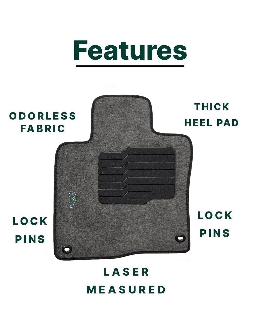 All ecoMats floor mats have Non-Slip Driver Heel Pad that gives your foot an extra grip. All floors have also safety locks that fit the manufacture's lock pins and Velcro tapes to keep your floor mats in place when your car is moving.