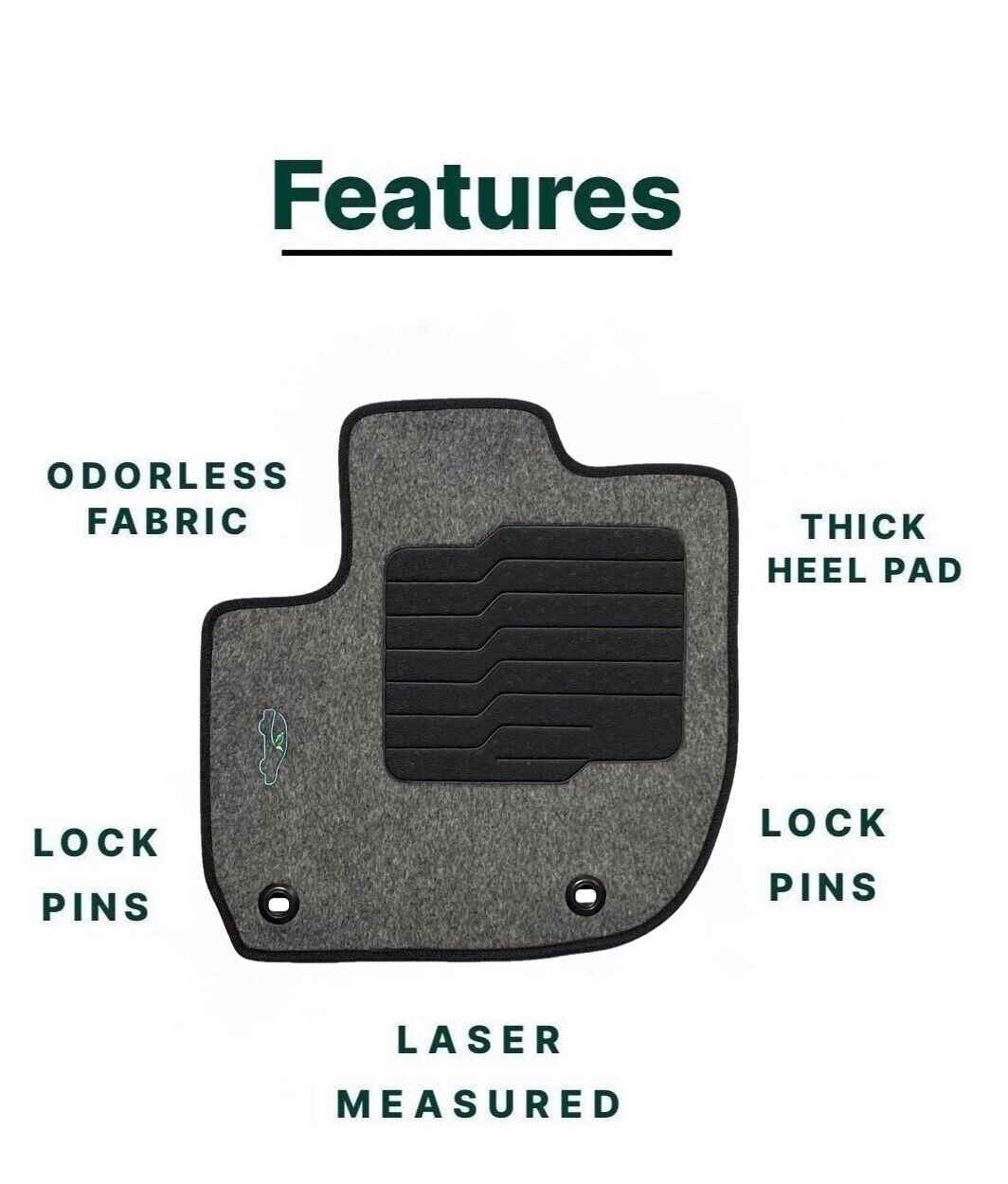 All ecoMats floor mats have Non-Slip Driver Heel Pad that gives your foot an extra grip. All floors have also safety locks that fit the manufacture's lock pins and Velcro tapes to keep your floor mats in place when your car is moving.