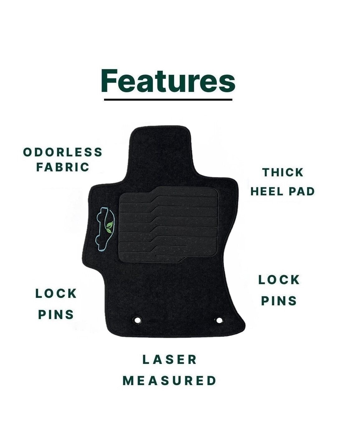 All ecoMats floor mats have Non-Slip Driver Heel Pad that gives your foot an extra grip. All floors have also safety locks that fit the manufacture's lock pins and Velcro tapes to keep your floor mats in place when your car is moving.