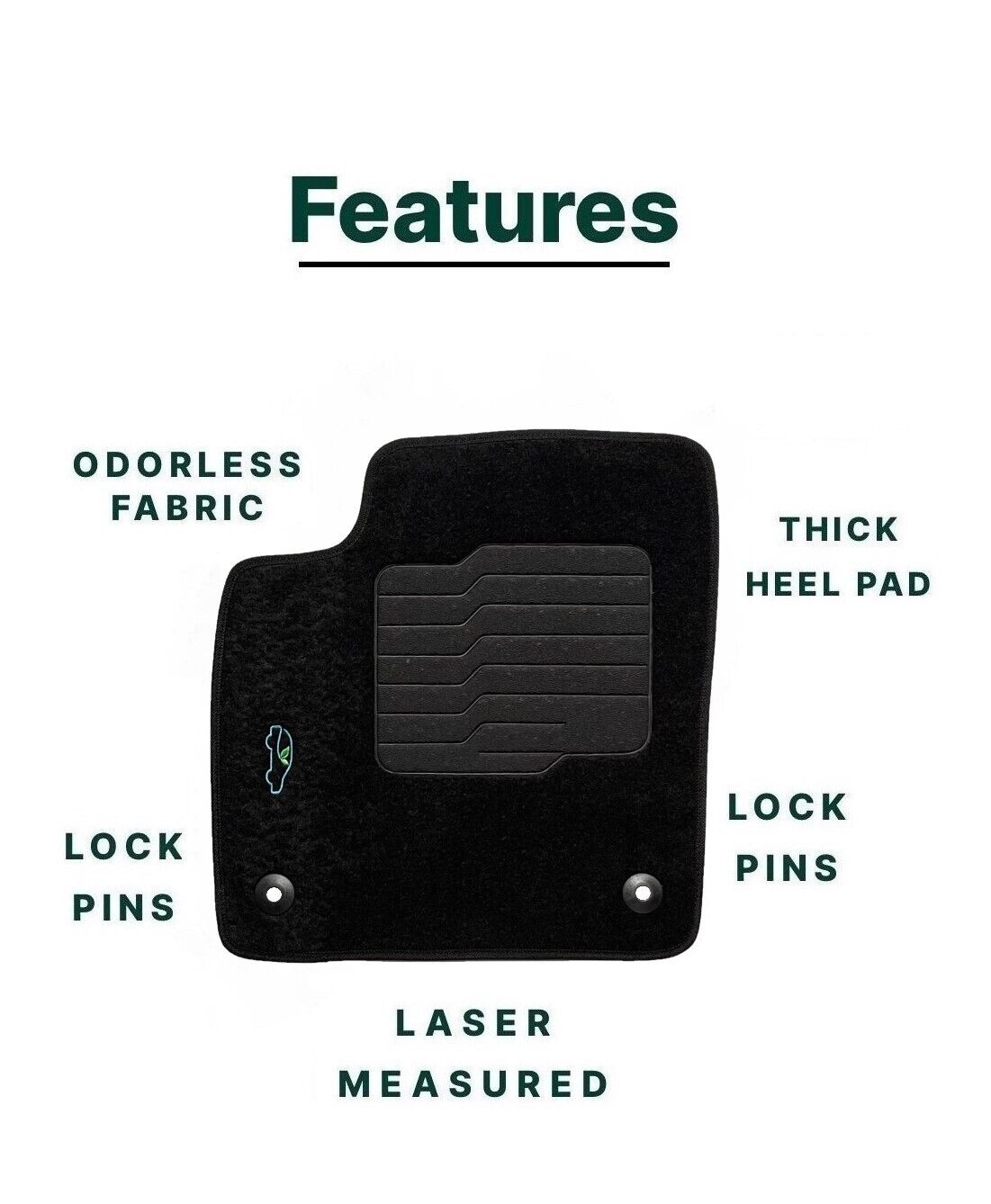 All ecoMats floor mats have Non-Slip Driver Heel Pad that gives your foot an extra grip. All floors have also safety locks that fit the manufacture's lock pins and Velcro tapes to keep your floor mats in place when your car is moving.