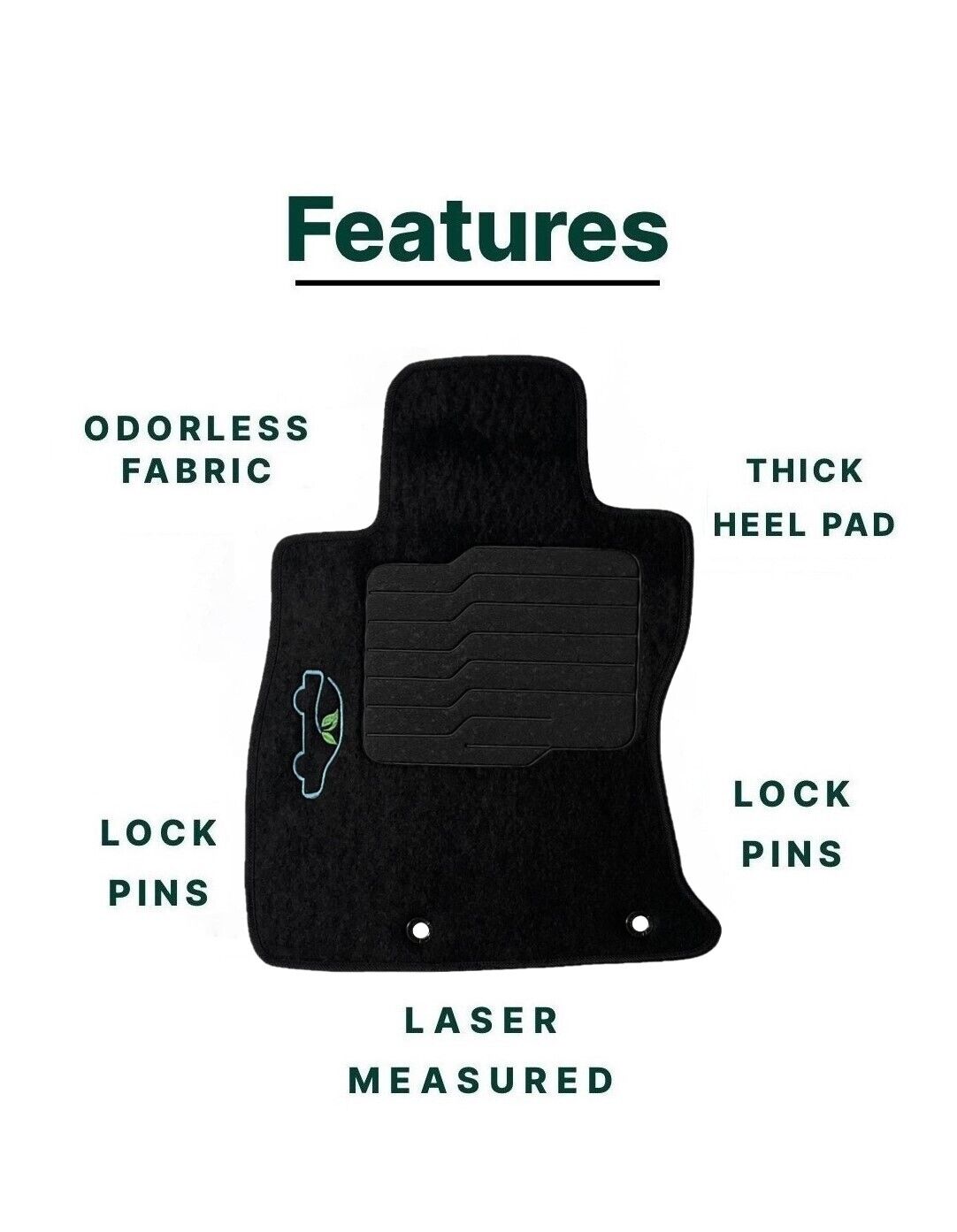 All ecoMats floor mats have Non-Slip Driver Heel Pad that gives your foot an extra grip. All floors have also safety locks that fit the manufacture's lock pins and Velcro tapes to keep your floor mats in place when your car is moving.