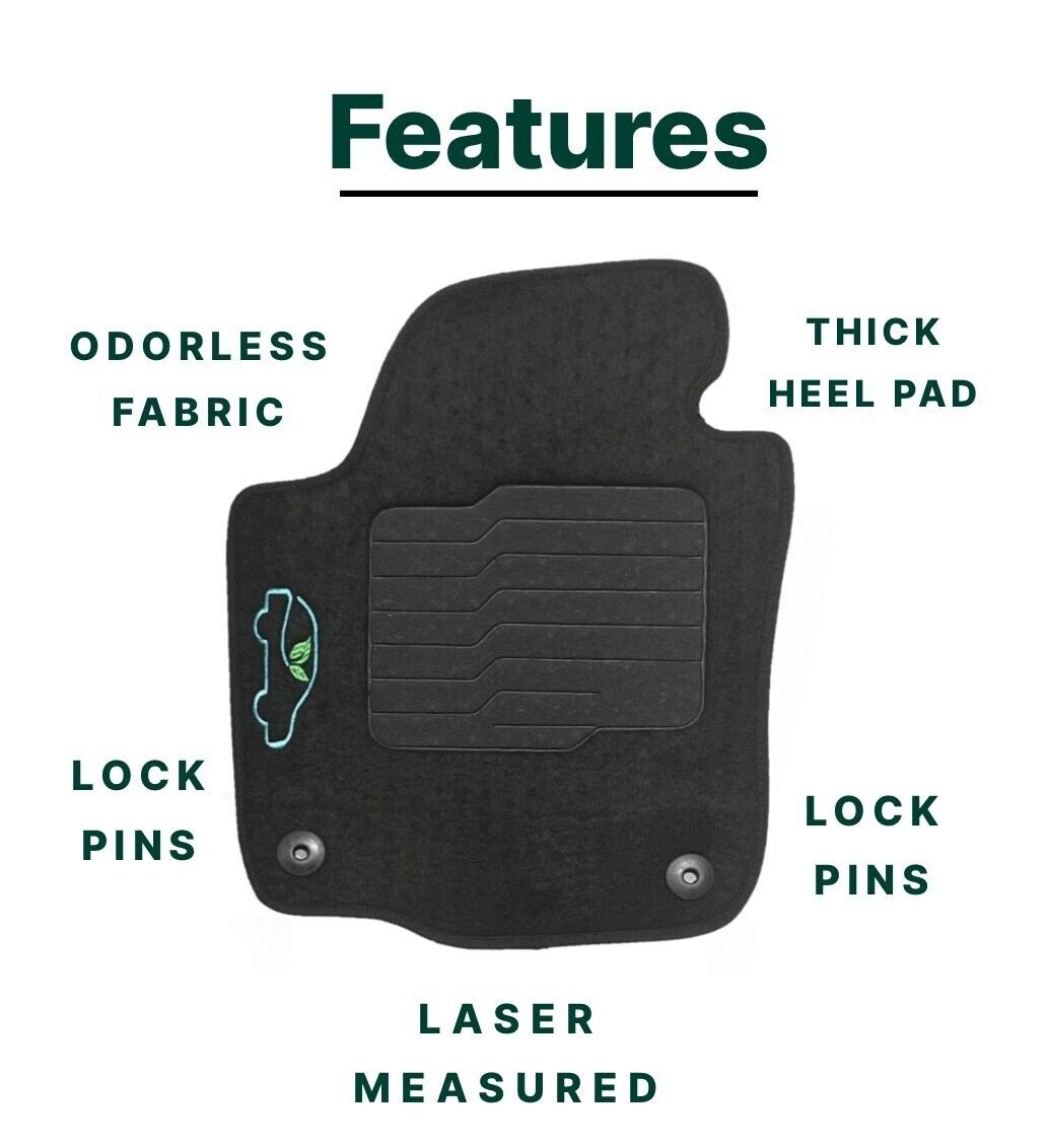 All ecoMats floor mats have Non-Slip Driver Heel Pad that gives your foot an extra grip. All floors have also safety locks that fit the manufacture's lock pins and Velcro tapes to keep your floor mats in place when your car is moving.