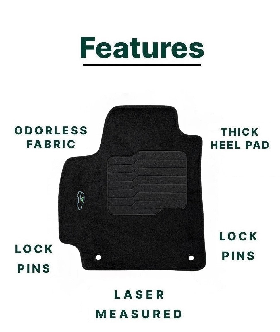 All ecoMats floor mats have Non-Slip Driver Heel Pad that gives your foot an extra grip. All floors mats have also safety locks that fit the manufacture's lock pins and Velcro tapes to keep your floor mats in place when your car is moving.