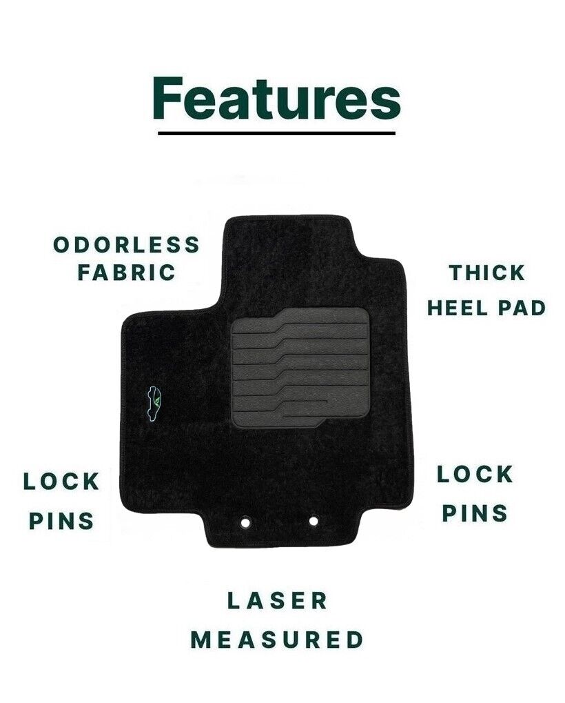 All ecoMats floor mats have Non-Slip Driver Heel Pad that gives your foot an extra grip. All floors have also safety locks that fit the manufacture's lock pins and Velcro tapes to keep your floor mats in place when your car is moving.