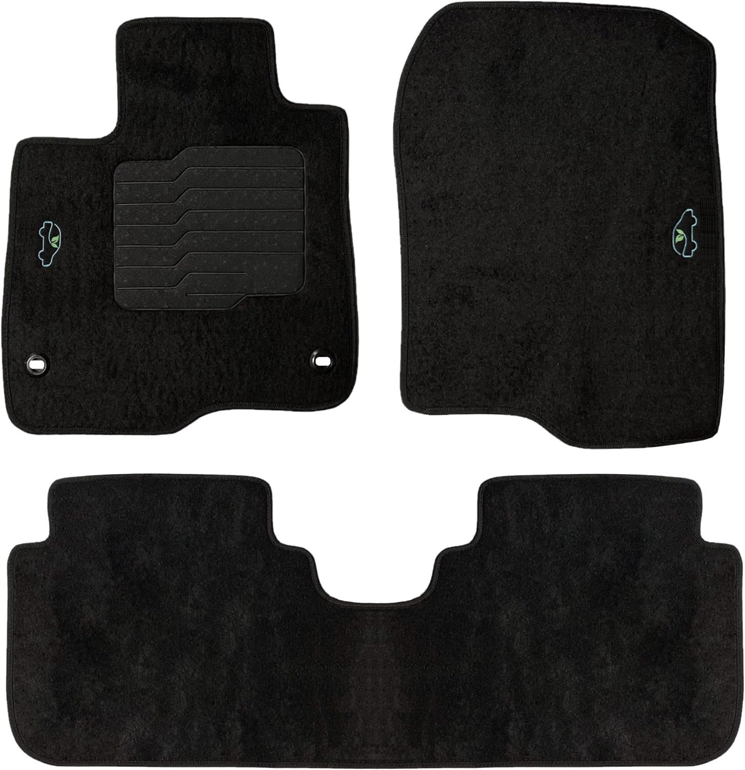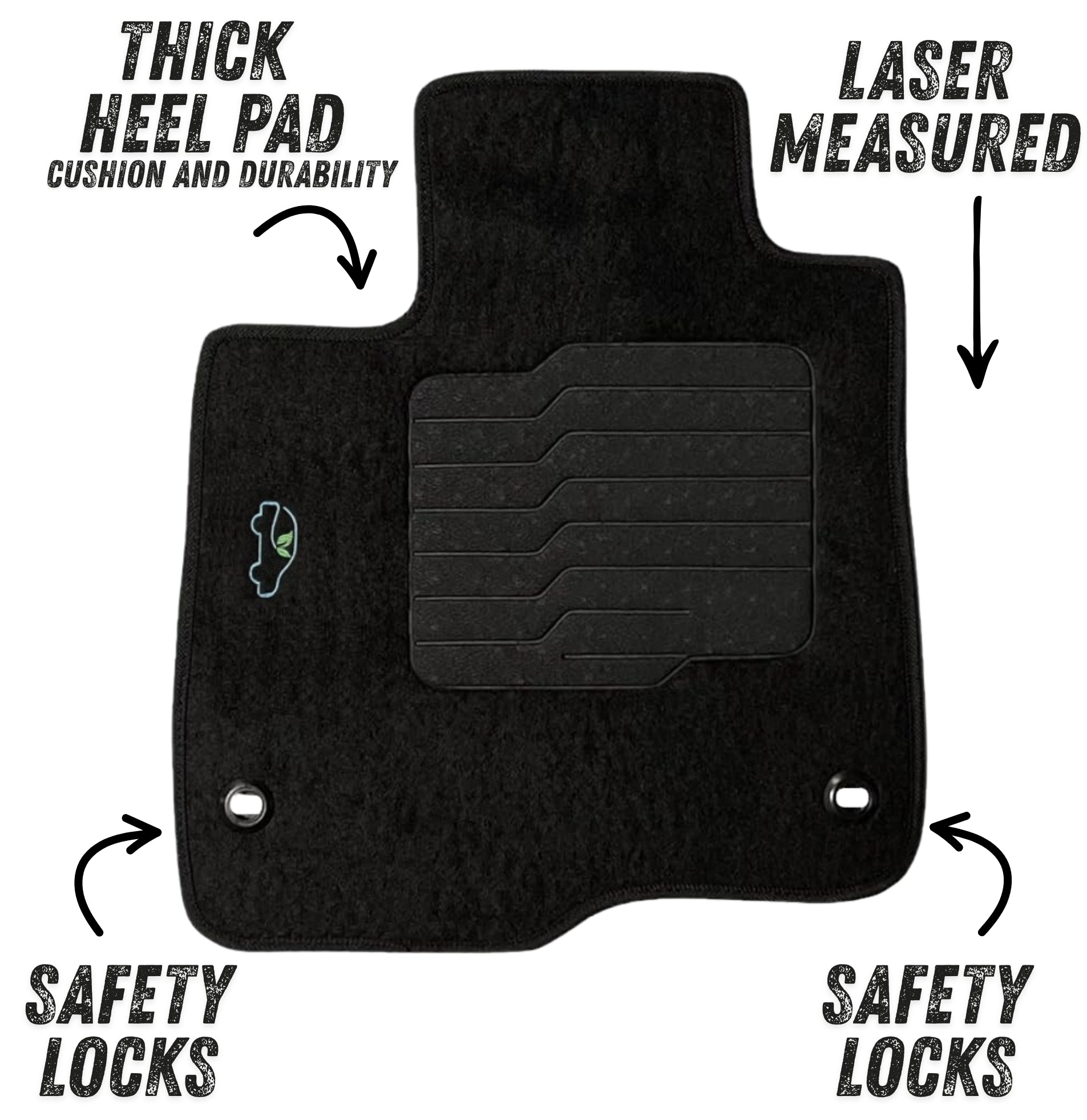 All ecoMats floor mats have Non-Slip Driver Heel Pad that gives your foot an extra grip. All floors have also safety locks that fit the manufacture's lock pins and Velcro tapes to keep your floor mats in place when your car is moving.