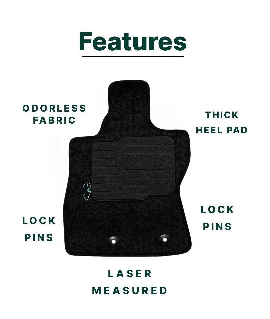 All ecoMats floor mats have Non-Slip Driver Heel Pad that gives your foot an extra grip. All floors have also safety locks that fit the manufacture's lock pins and Velcro tapes to keep your floor mats in place when your car is moving.