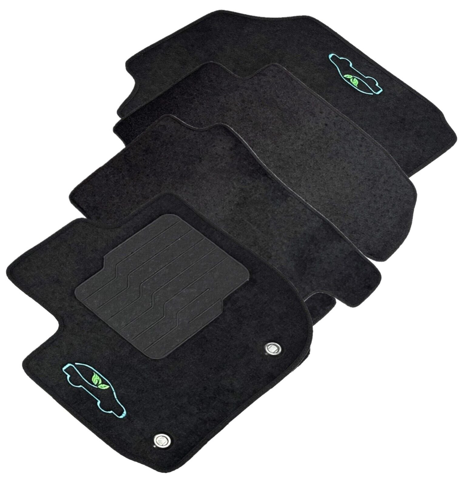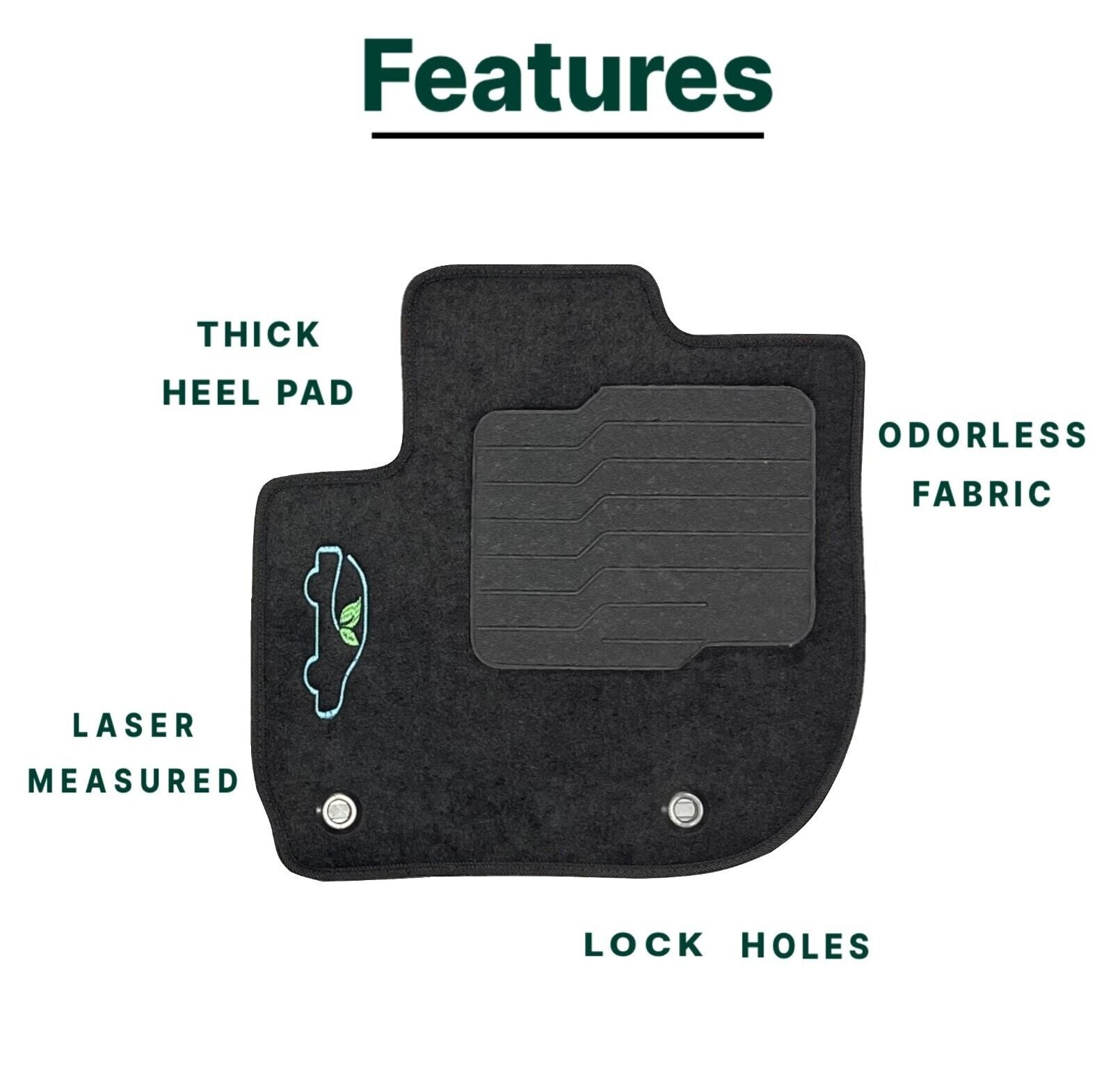 All ecoMats floor mats have Non-Slip Driver Heel Pad that gives your foot an extra grip. All floors have also safety locks that fit the manufacture's lock pins and Velcro tapes to keep your floor mats in place when your car is moving.