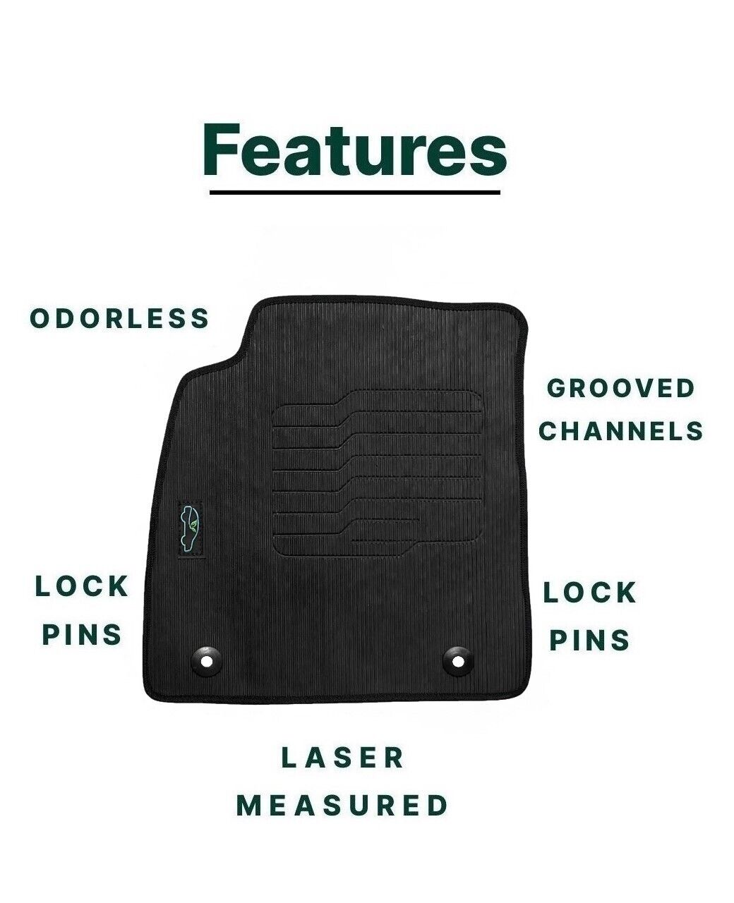 All ecoMats floor mats have Non-Slip Driver Heel Pad that gives your foot an extra grip. All floors have also safety locks that fit the manufacture's lock pins and Velcro tapes to keep your floor mats in place when your car is moving.