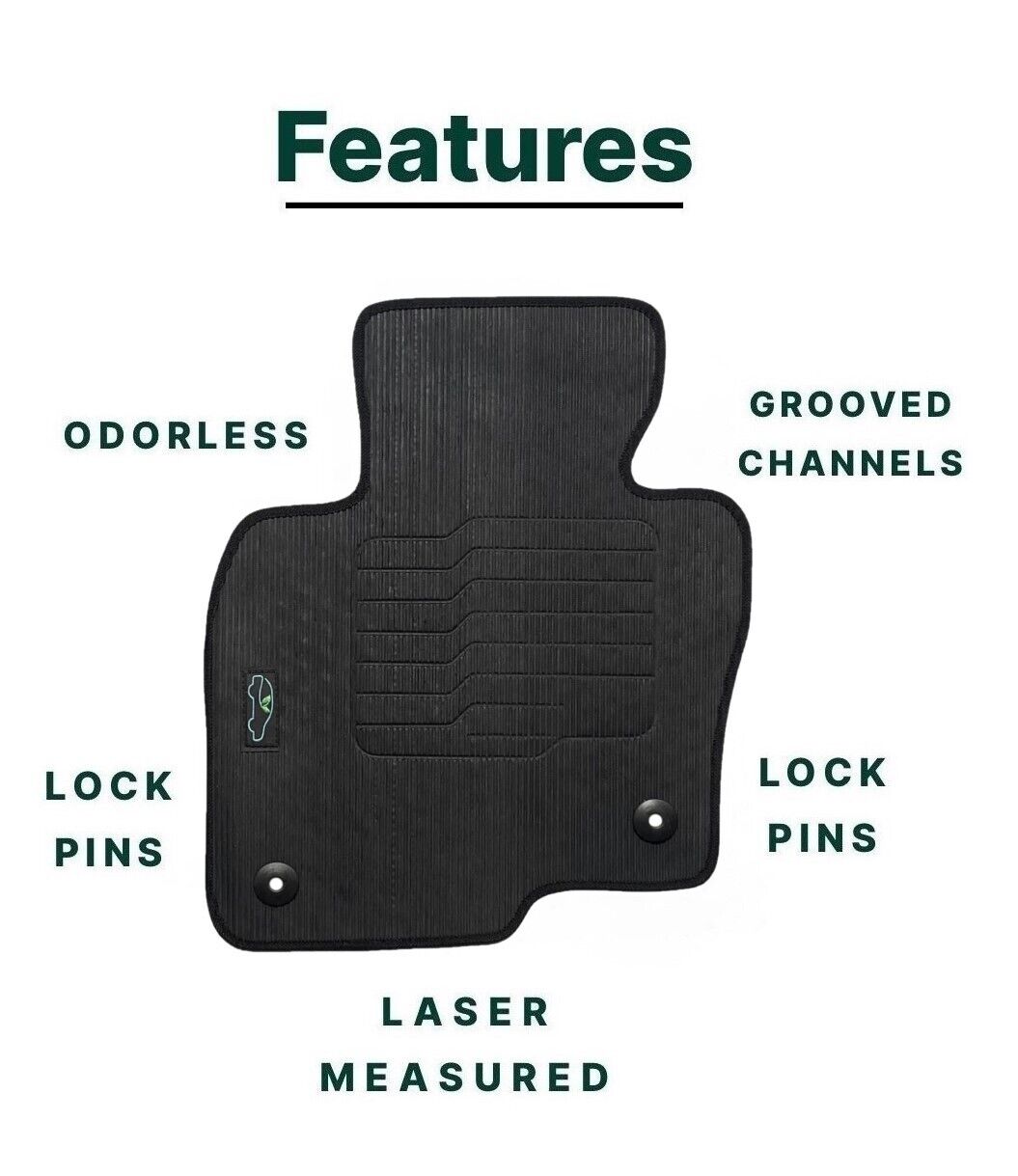 All ecoMats floor mats have Non-Slip Driver Heel Pad that gives your foot an extra grip. All floors have also safety locks that fit the manufacture's lock pins and Velcro tapes to keep your floor mats in place when your car is moving.